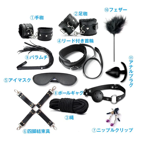 可以輕鬆準備 BDSM 遊戲的基本物品的豪華套裝 ! 標準手銬、腿腳銬、球塞 (ball gags)、眼罩、帶鉛的項圈、皮鞭、繩索、撓痒癢的羽毛等 11 件包括四腳捆綁(捆綁手銬腳鍊)和肛門塞。 超值套裝,推薦給SM玩新手到輕度用戶!