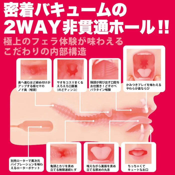 在她的全程監督下,長長的舌頭和豐盈的嘴唇被完整再現,而電動式無法實現的細緻內部結構也被成功雕刻出來。再現了超過500g的厚實緊密接觸、人造黏膜的兩層結構以及各種口腔機關,再現了【新村朱里】的連續真空口交。