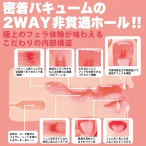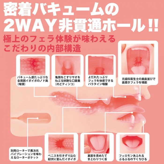 在她的全程監督下,長長的舌頭和豐盈的嘴唇被完整再現,而電動式無法實現的細緻內部結構也被成功雕刻出來。再現了超過500g的厚實緊密接觸、人造黏膜的兩層結構以及各種口腔機關,再現了【橘瑪麗】的連續真空口交。