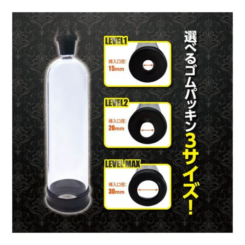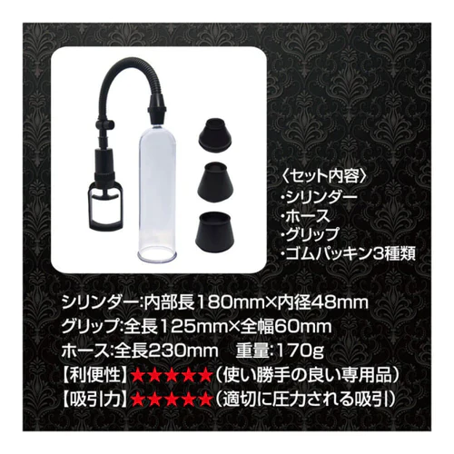 我們擁有您需要的一切,例如可以用一隻手抓住的扳機桿,一個一鍵式壓力釋放按鈕,一個可以讓您看到尺寸的透明氣缸,以及您可以選擇尺寸的三種橡膠包裝!握住控制桿呼吸空氣,用吸力讓男人變大!