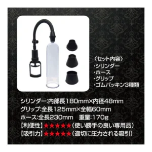 由於扳機桿為手動式,因此易於控制微調!壓力釋放按鈕設計,只需按一下即可消除吸力!圓柱體非常適合您的尺寸,內部長度為 180 毫米,內徑為 48 毫米!插入槽的橡膠墊有 3 種尺寸(15 毫米、20 毫米、30 毫米)!